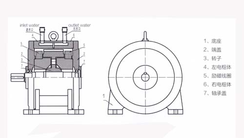 CW型電渦流制動器由轉子(帶有槽輪)、定子(包括左右電樞體、勵磁線圈、端蓋、軸承蓋)、機座組成。 2.CW電渦流制動器的工作原理 當與轉子同軸裝配的勵磁線圈通有直流電視時,其產生的磁通經電樞體、渦流環、氣隙和轉子形成磁閉合回路。由于轉子外圈面被制成均勻分布的齒和槽,故在氣隙和渦流環內表面產生疏密詳見的磁場。因此,當轉子被拖動旋轉時,在渦流環內表面的任一點的磁場產生交變變化,由此感應出,該“渦流”所形成的磁場又與原氣隙磁場相互作用,在轉子上就產生了制動力矩。動力機輸出的功率被轉化成渦流環上“渦流”產生的等值發熱量,該熱量由進入渦流環冷卻水槽中持續不斷的冷卻水帶走。 電渦流制動器主要技術參數: