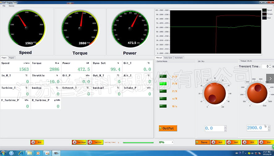 (3)上位機控制系統配置及主要功能 上位計算機選用研華工控機,工控機及所需板卡選用知名品牌。送預留今后可供擴展的串口給用戶使用,根據用戶提供的通訊協議集成到計算機系統中。 工控機配置:酷雙核2.6G以上、RAM:1G、硬盤:250G、10/100M自適應網卡、19英寸液晶顯示器、RS232/485擴展卡。 記錄功能 控制系統需對測量數據及故障信息實時上傳及存儲。自動保存數據到網絡數據庫,在網絡數據庫故障時暫時保存數據到本地數據庫,在適當的時候再轉儲到網絡數據庫。 自動生成報表和曲線。 報警保護功能,測量控制系統具有三級報警和保護功能,每個測量參數均可由用戶在計算機設定每級報警的動作方式: 一級報警:聲光報警,系統不動作,由人工進行干預; 二級報警:聲光報警,系統動作,發動機工況自動降至怠速; 三級報警:聲光報警,系統動作,通過緊急停車機構使發動機停車。 試驗臺架配停車電磁鐵,故障時,按下任一急停按鈕,停車電磁鐵切斷油路(油耗儀后部)。 整個上位機控制系統以組態專用軟件為核心,配以試驗條件編輯、試驗數據處理、試驗過程控制等軟件,上、下機之間通過現場總線實現數據交換,完成整個發動機試驗控制過程中全部數據處理及屏幕顯示。所有的測量參數均可在液顯上顯示。顯示方式:數字顯示和曲線顯示。扭矩、功率和油耗可以由計算機自動校正,校正公式可以按機型自動選擇(按國標GB/T18297-2001),也可以由操作工人工輸入計算。 按設定步驟自動完成各項程序控制試驗。步數的組合可根據試驗任意組合。測量的數據按JIS標準和GB/T6072.1-200國家標準對功率、扭矩、油耗進行運算、修正、統計分析和輸出。 在計算機屏幕上可自動生成各種普通試驗特性曲線和試驗數據報表(可導出Word或Excel格式)。 軟件采用即插即用的設計技術,由用戶增刪、編輯、調整、顯示測量參數。軟件容易擴展,而不需要修改原程序;具有自學習和自組織功能,對發動機故障數據庫的自擴充,對用戶操作使用頻率自記憶,對所有需人機對話的均自動判斷,給出最優的方案,具有故障記錄功能,逐步實現人性化操作。 試驗臺架測量參數主要技術指標(根據用戶需要可選項)